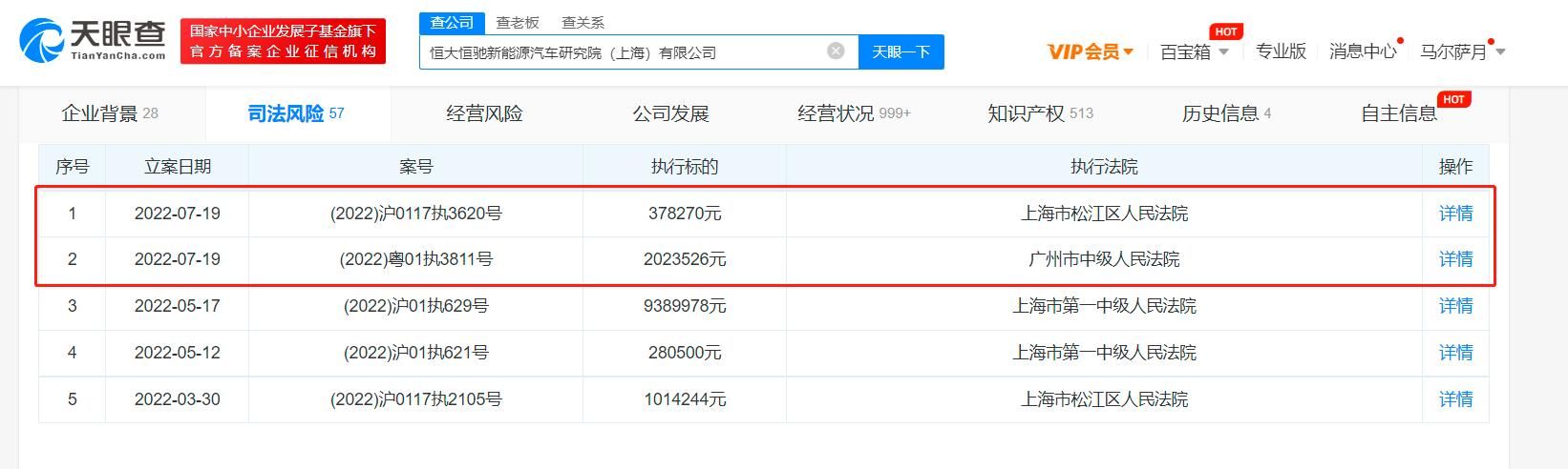 鞭牛士 7月21日消息,天眼查App显示,近日,恒大恒驰新能源汽车研究院(上海)有限公司新增两则被执行人信息,执行标的分别为202.35万余元、37.82万余元,共约240.17万余元,执行法院分别为广州市中级人民法院、上海市松江区人民法院。目前,该公司被执行总金额超1308万元。